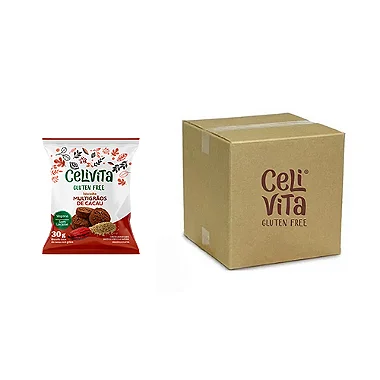 Caixa com 8 displays com 14 unidades de saquinhos de 30g cada com biscoitos.